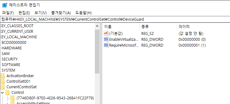 - HKEY_LOCAL_MACHINE\System\CurrentControlSet\Control\DeviceGuard로 이동합니다.