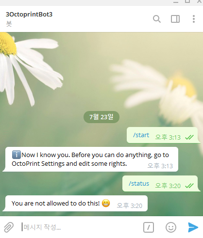 여기까지 하고 다 끝났다 싶어서 텔레그램에서 명령을 내려 보았다.