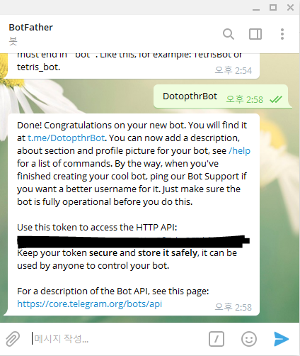 2. 봇 생성시 발급되는 API 값은 중요하다. 잊어버리지도 말고, 유출되지도 말자.