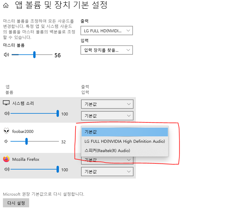 여기서 필요한 앱에 대한 출력을 원하는 사운드 장치로 선택해 주면 된다.