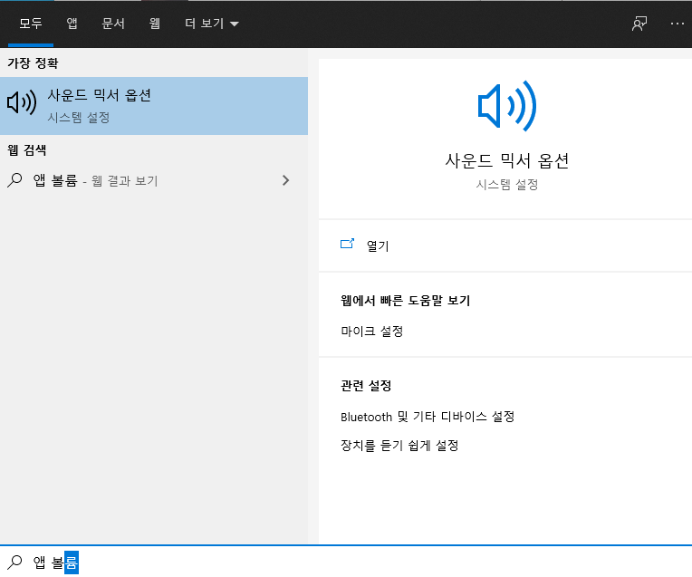 스샷과 같이 작업표시줄 돋보기를 클릭하고 앱 볼륨이라고 치면 사운드 믹서 옵션이라고 뜬다.(검색어는 알아서 비슷하게 하면 될 것 같다. )