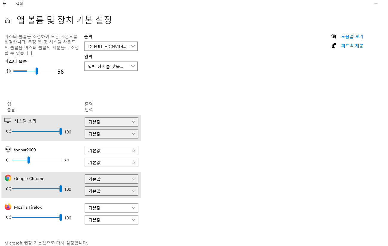 그래서 관련하여 찾아보니 앱별로 사운드 장치를 선택 해 줄 수 있다.