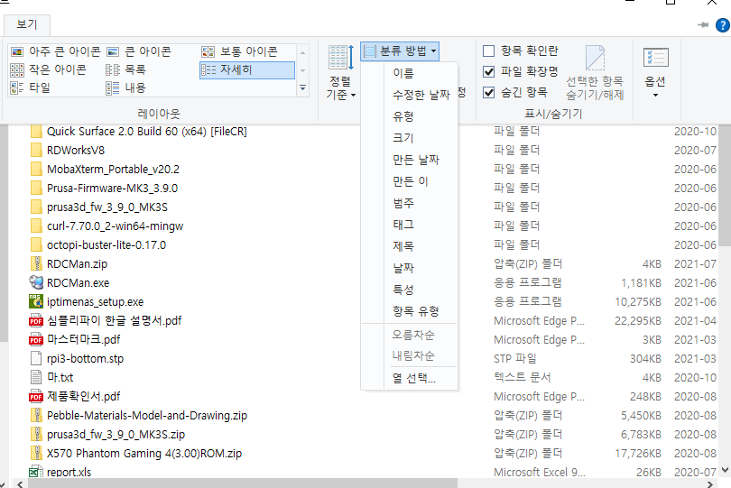 탐색기에서 보기를 눌러보면 신경쓰지 않았던 분류방법 이라는 항목이 있다. 좌측에 있는 정렬 기준의 하위 정렬기준이라고 보면 될 것 같다. (아니 그 반대일지도?)