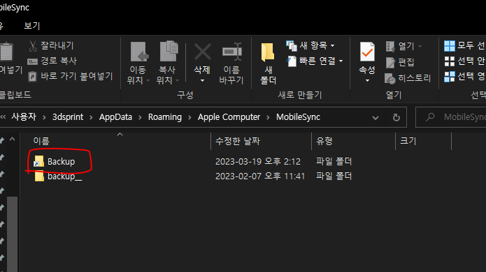 우선 기존 백업 폴더 명을 다른 이름으로 바꾸자. (탐색기에서도 가능하나 타고타고 들어가 수정하기 귀찮은 분들은 아래를 카피하자.)
